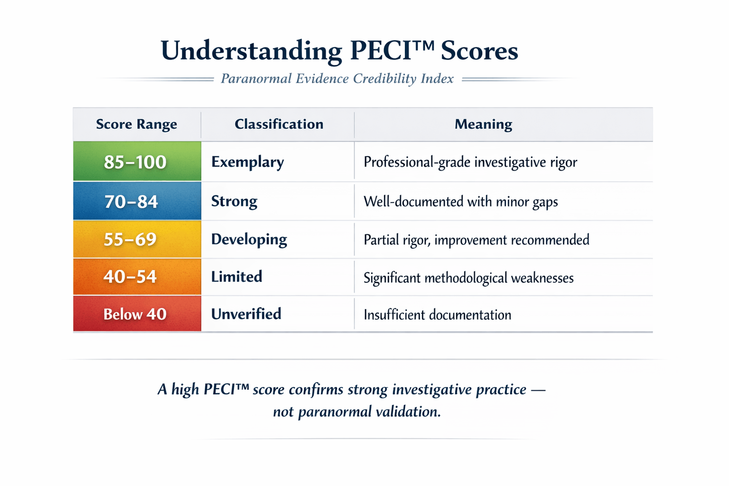 PECI™ (Paranormal Evidence Credibility Index) is a transparent, process-based credibility framework designed to evaluate how paranormal investigations are conducted, not what conclusions are reached.